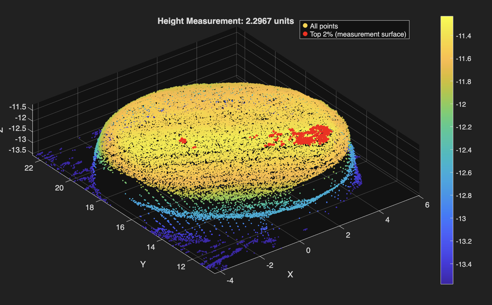 Raw laser scans are converted from CSV into structured (x,y,z) data, lightly downsampled to suppress noise, and referenced to a statistically defined platform surface identified via upper-percentile thresholding in the z-direction. Heights are extracted from the median of the top fraction (98th percentile) of points above this reference, which minimizes sensitivity to outliers and local surface artifacts, while an optional least-squares plane fit provides a geometric consistency check on the top surface. The code adapts automatically to scan resolution by adjusting percentile thresholds based on the number of points in the dataset, ensuring consistent behavior across varying scan densities. Importantly, the reported height error is not inferred solely from point-cloud variance but was calibrated empirically by averaging the deviation between measured heights and known heights of 3D-printed reference samples across dozens of independent scans, anchoring the uncertainty to repeatability.